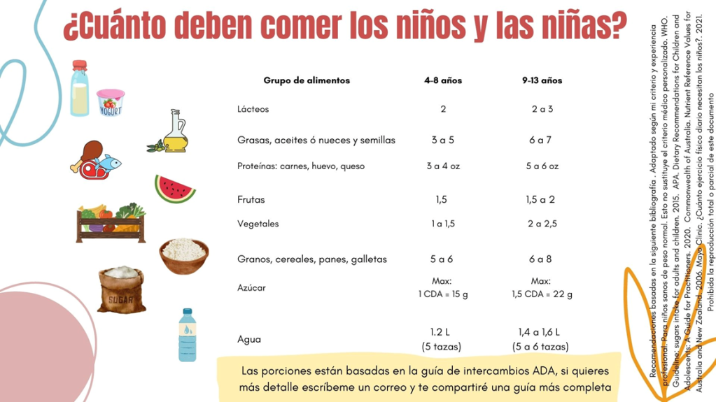 A continuación, les voy a dejar una guía de cuánto aproximadamente debe comer un niño sano, cabe aclarar que esto no sustituye el criterio médico personalizado, sin embargo, la idea es que ayude a los papás a balancear las comidas que les ofrecen a los niños.