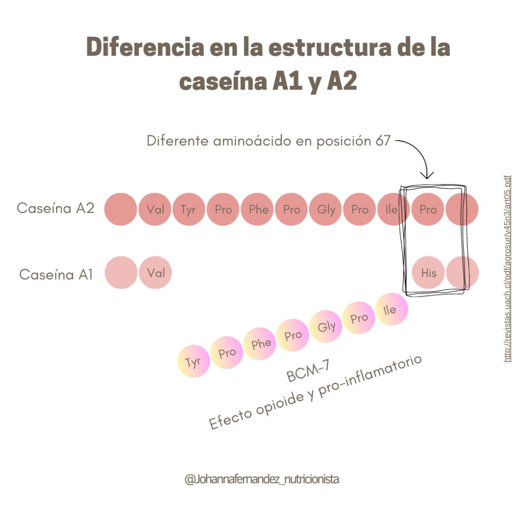 La caseína es una proteína compuesta de 209 aminoácidos, resulta que el aminoácido número 67 es diferente en ambas caseínas. La A1 tiene Prolina y la A2 tiene Histidina. Esto genera una diferencia a la hora de cortar la proteína en el intestino, ya que la caseína A1 al romperse produce un péptido llamado BCM-7, que es un componente parecido a un opioide, que enlentece el tránsito intestinal, además afecta la microbiota y genera inflamación en el intestino. La caseína tipo A2, no genera dicho péptido con efecto opioide, por lo que no produce esta afectación intestinal.