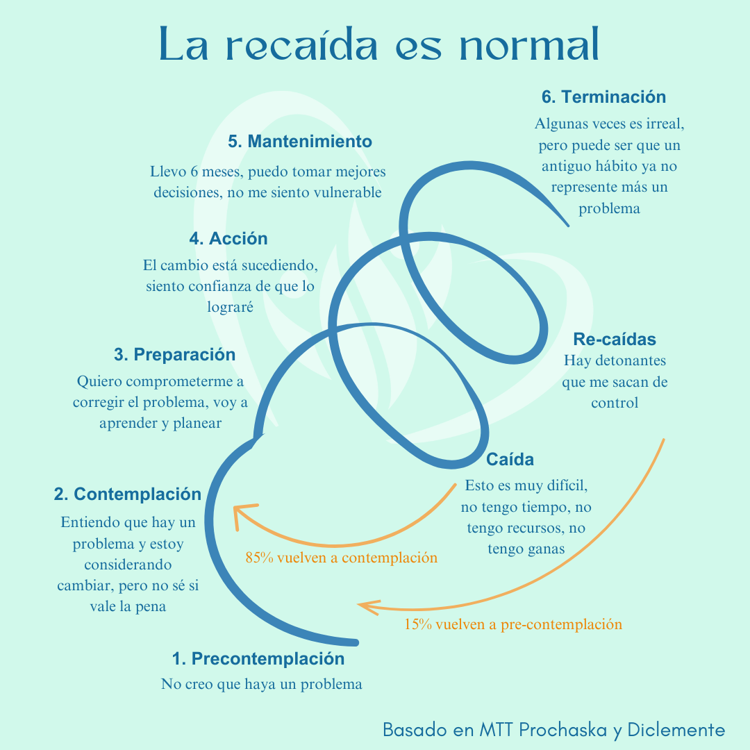 Las recaídas son universales en el cambio de hábitos. El modelo de Prochaska y Diclemente nos muestra que el cambio es cíclico, no lineal. Ser compasivo contigo mismo durante estos momentos es crucial.
